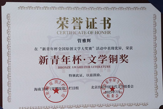文章完成后,班主任李安興老師鼓勵(lì)我大膽嘗試投稿。在他的幫助下,我懷著忐忑又期待的心情,將文章投給了海南衛(wèi)視《榮耀綻放》欄目組,以及由北京出彩中國(guó)當(dāng)代文學(xué)組委會(huì)主辦的“新青年杯全國(guó)原創(chuàng)文學(xué)大獎(jiǎng)賽”。從初審、大眾投票到終審,每一步我都格外關(guān)注,而最終的結(jié)果,遠(yuǎn)遠(yuǎn)超出了我的預(yù)期——經(jīng)過專家評(píng)審團(tuán)的最終評(píng)定,我的文章有幸獲得了本次大賽的“文學(xué)銅獎(jiǎng)”。得知獲獎(jiǎng)的那一刻,內(nèi)心的激動(dòng)與喜悅幾乎無法用語言形容:這不僅是對(duì)我個(gè)人努力的肯定,更是對(duì)我所熱愛的計(jì)算機(jī)專業(yè)、對(duì)日新月異的AI技術(shù)的認(rèn)可。