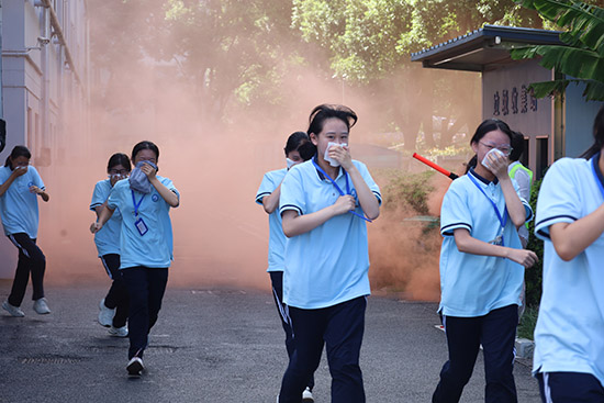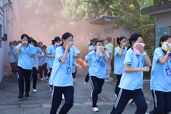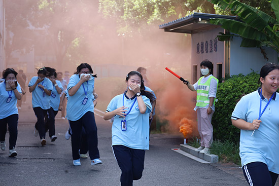 隨著模擬火災警報聲響起,演練正式開始。高一新生在教官與班主任的指引下,迅速用濕毛巾捂住口鼻,沿著預設逃生路線快速向操場指定安全區域疏散。整個過程中,同學們反應迅速、秩序井然,未出現擁擠、推搡現象,到場后各班迅速清點人數并向校安辦匯報,疏散率達 100%,演練整體達到預期效果。?