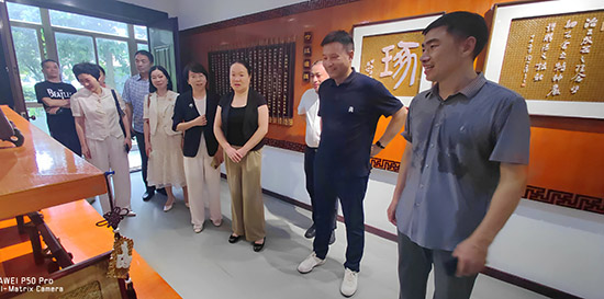 在漆器漆藝傳承工作室,青年漆藝藝術家、瑞安市技能大師工作室負責人韓正鑫向調研組介紹了瑞安漆藝的悠久歷史及其個人創作心得,并重點解讀了多幅入選全國展覽的獲獎漆畫作品。在學生成果展示區,韓正鑫匯報了依托工藝美術專業,通過選修課、校本教材開發及興趣小組等多種形式開展傳承教育的具體做法。曹鴻對溫州漆藝的精湛技藝表示贊賞,并對青年一代積極投身傳承深感欣慰,鼓勵大家勇擔使命,持續推動漆藝創新發展。針對工作室外部標識不夠醒目的問題,曹鴻等領導建議盡快懸掛“溫州漆鋪”標牌,以增強品牌識別度。