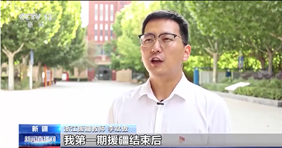 報道中,浙江省玉環市援疆教師李斌傲接受采訪。他表示:“作為一名95后援疆教師,我第一期援疆結束后,又主動申請再一次援疆,投身援疆倍感光榮。我們要接續努力,一批接著一批干,為新疆教育水平提升和人才培養,盡自己所能做好工作,傳承‘胡楊精神’,和新疆各族干部群眾一起譜寫中國式現代化新疆篇章。”