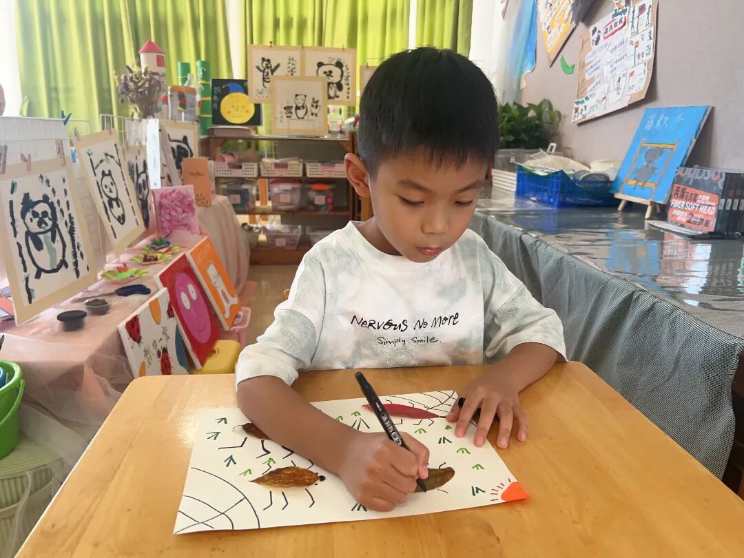 秋葉感悟。秋天的大自然到處都是美景,來一場美上加美的活動吧。用樹葉拼貼圖案,不乏藝術享受之美。各色各樣的樹葉,在幼兒們的精挑細選下來到手中,坐在教室,對這些不同色彩、形狀的樹葉拼貼組合,不一會兒就變成了一幅幅美麗的畫。樹葉拼貼畫,讓幼兒們對植物有了更深的觀察和記憶,創意拼貼,一幅幅畫展示了幼兒們的想象力及創造力。