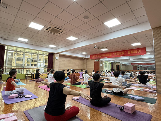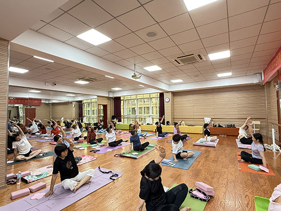 學(xué)員們早早來到教室,整齊地鋪好瑜伽墊,跟著沈老師的口令調(diào)整呼吸,慢慢伸展肢體,用輕柔的瑜伽動作,為新學(xué)期的健康生活按下“啟動鍵”。