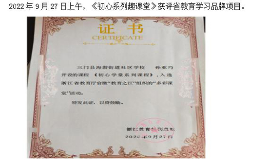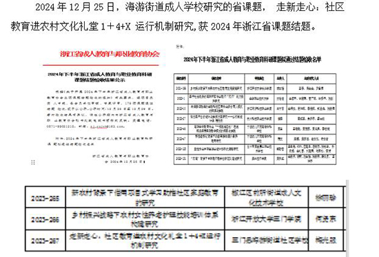多年來,以點帶面、點面結合,以《“初心接力”學習館》為學習體驗基地,發揮海游街道社區學校的教育主陣地作用開展初心接力學習,創建有標識度、美譽度和知名度的初心接力學習教育品牌。自2017年開館以來,學習不斷創新突破,品牌效應日益凸顯,深受各單位居民的青睞,每年預約報名人數火爆,年學習超兩千人次,堅持科研引擎,依托思政教育指導教學名師工作室,編印《“初心接力”學習課堂系列》和《“初心接力”學習通識讀本》等思政讀物,以及科普讀物,立項或結題6項各級各類課題和資源建設項目。“初心接力”學習實踐基地獲評臺州市初心接力學習教育實踐基地。成立臺州市初心接力學習教育指導教學工作室、臺州市初心接力學習教育研究重點實驗室、臺州市初心接力學習教育聯盟等。其中具有代表性的如2024年浙江省課題結題.走新走心:社區教育進農村文化禮堂1+4+X 運行機制研究、《初心系列趣課堂》獲評省教育培訓品牌項目,成功打造了社區思政素質教育新“范式”。