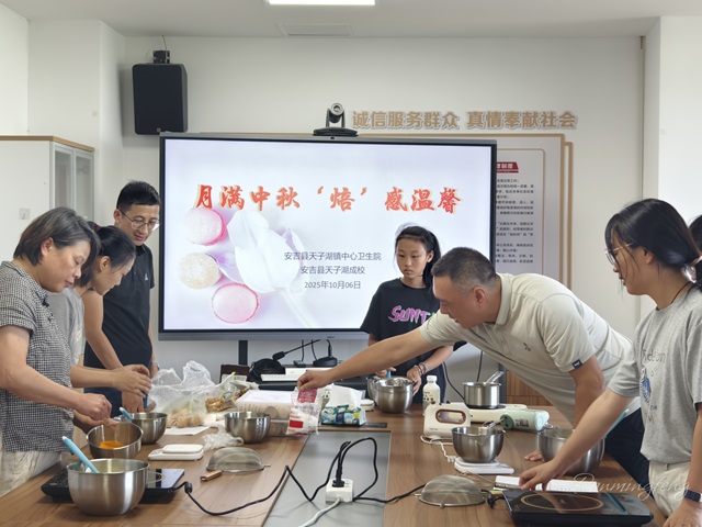 10月6日,中秋佳節,安吉縣社區教育學院天子湖分院為天子湖鎮衛生院醫護人員舉辦法式馬卡龍烘焙培訓,以甜蜜手藝傳遞節日祝福,近 20 名醫護人員在專業指導下體驗烘焙樂趣。?