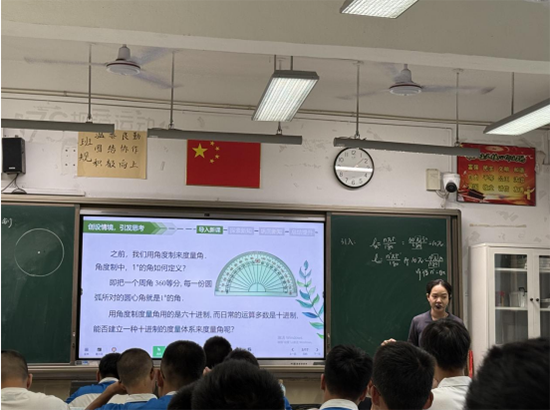 活動伊始,溫州市龍灣區(qū)職業(yè)技術(shù)學(xué)校王建子老師帶來了一節(jié)題為《弧度制》的公開課。王老師以“為何要為圓量身定制一把尺子”為切入點,引導(dǎo)學(xué)生從生活實際出發(fā),思考角度制的局限,自然引入弧度制的概念。課堂上,她巧妙運用幾何畫板實時演示弧長與半徑的關(guān)系,幫助學(xué)生直觀理解“弧度”的本質(zhì);學(xué)生通過繩子與圓規(guī)動手操作,親身體驗“1弧度”角的形成過程,深化對“弧度是弧長與半徑比值”這一核心概念的理解。