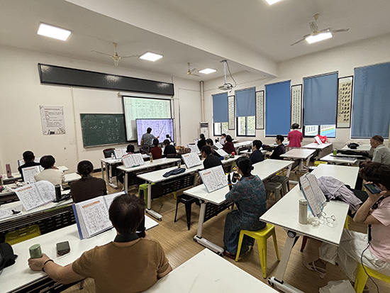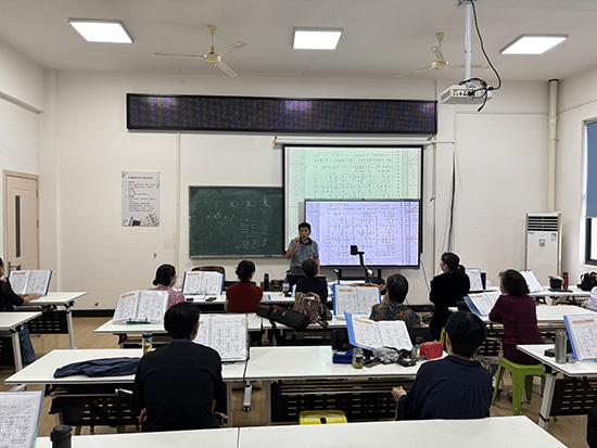 課堂上,吳商擔老師照例先帶領學員們復習鞏固上次課程所學的曲目與技巧。學員們手持電吹管,神情專注,在吳老師的悉心指導下,認真練習,力求每個音符都準確無誤。悠揚的旋律在教室中回蕩,展現了學員們積極向上的學習熱情和日漸精湛的演奏技藝。