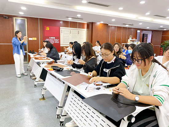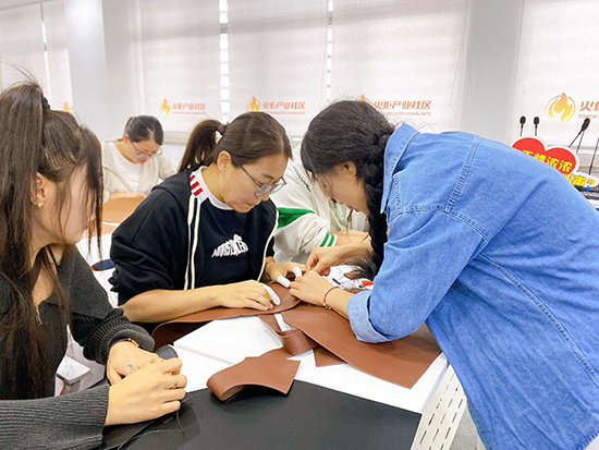 舒緩的輕音樂在現(xiàn)場流淌,大家圍坐在一起,時而專注地穿針引線,時而互相交流制作技巧,偶爾為彼此的創(chuàng)意設計點贊。平時在辦公室對著電腦久坐,這次親手做皮包,不僅鍛煉了動手能力,更感覺身心都放松下來了。