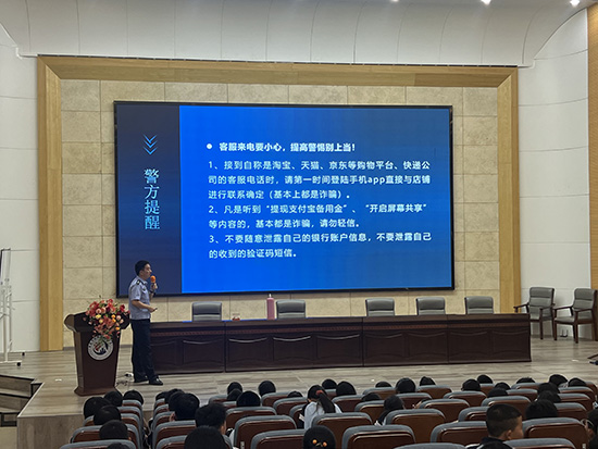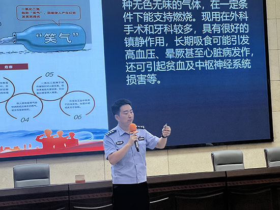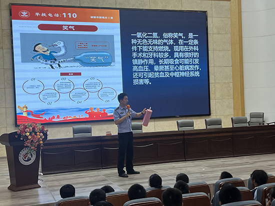 談及預防電信詐騙,魏警官精準剖析了學生群體易遭遇的詐騙套路;而在識毒禁毒環節,他更是帶來派出所近期收繳的“笑氣”實物樣品現場展示,嚴肅警示:“這看似是‘娛樂’用品,實則是新型陷阱,大家的好奇心絕不能碰觸法律紅線!”整場講座互動感十足,鮮活的案例讓每一位學生都沉浸其中,引發深度思考。
