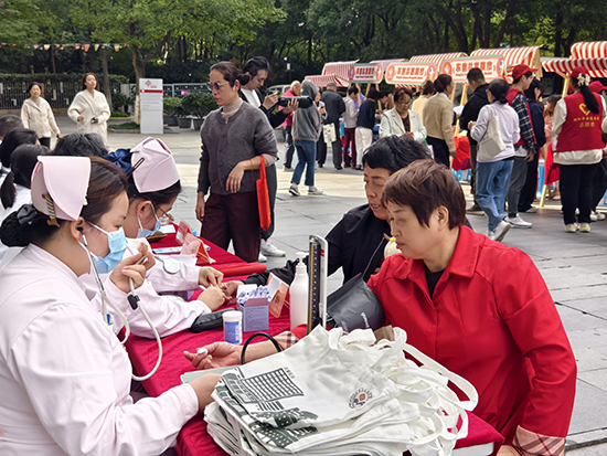 活動當天,社區鄰里坊熱鬧非凡,五大特色區域依次排開,每個角落都洋溢著敬老愛老的暖心氛圍。“桑榆情暖·便民服務區”提供免費縫補、磨刀、理發、小家電維修,把便利送到老人身邊;“健康同行·養生體驗區”集結健康咨詢、血壓測量、牙科義診、推拿按摩等服務,搭配中藥養生問答,守護長輩安康;“匠心手作·文化傳承區”里,“艾”在重陽養生錘制作、“囊”情寄意茱萸香囊DIY同步開展,讓傳統手藝與養生智慧代代傳;“樂活時光·趣味游園區”的秋日投壺、果蔬套圈、吹球過河,讓老人們重拾童趣;“雅致文化角”則以拓印福字、宋代點茶品鑒,勾勒雅致重陽意境。現場還向參與老人分發傳統重陽糕,甜香里共享佳節滋味。