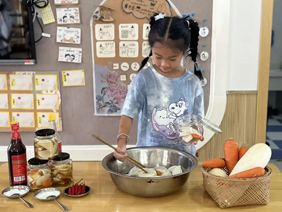 “霜降腌蘿卜”是刻在傳統里的生活智慧?;顒右潦?,老師帶著新鮮蘿卜拋出問題:“蘿卜長在土里還是樹上?”“我們吃的是蘿卜的根還是葉子?”帶著好奇,孩子們走進“快樂農場”親手播下蘿卜種子,期待泥土里的驚喜;回到教室后,大家圍坐在一起,洗蘿卜、切蘿卜、撒鹽腌制,看著清脆蘿卜慢慢入味。這不僅是一次民俗美食制作,更讓孩子們在實踐中懂得了“順應時節”的生活道理。