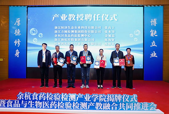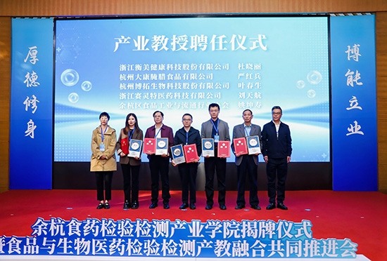 為強化“校企協同教學”,產業學院還聘任了來自浙江恒澤、方圓檢測、余杭區食藥監測中心、海虹控股、鴻光浪花、衡美健康、大康食品、博拓生物、賽靈特醫藥、區食品工業與流通行業協會十家單位代表為首批“產業教授”,由余杭區政府、市教科院、區經信局、區市場監管局等領導頒發聘書。