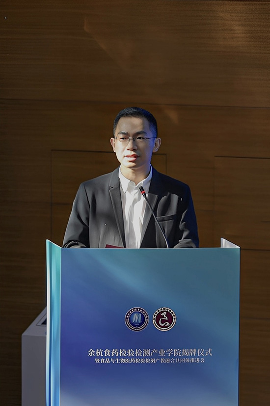 儀式伊始,余杭區人民政府副區長羅建強代表區政府致歡迎辭。他指出,食品藥品安全是重大民生工程,近年來余杭區圍繞“全球生物醫藥研發高地”目標,依托良渚生命科技小鎮集聚產業資源,構建生命健康產業生態圈。此次聯合浙江經貿職業技術學院、省骨干龍頭企業浙江恒澤生態農業科技有限公司,成功申報全省首批縣域產業學院,正是響應省教育廳縣域產業學院建設政策的關鍵舉措,旨在打造“人才培養、技術研發、社會服務”三位一體的產業創新平臺。“學院將推動學習場景向檢驗實驗室、生產一線延伸,通過‘培養方案共定、實訓基地共建、教學團隊共組、科研項目共擔、就業崗位共促’,為余杭輸送懂理論、精操作、善創新的食藥檢驗檢測人才。”羅建強表示,區政府將持續強化政策賦能與資源整合,全力支持學院發展。