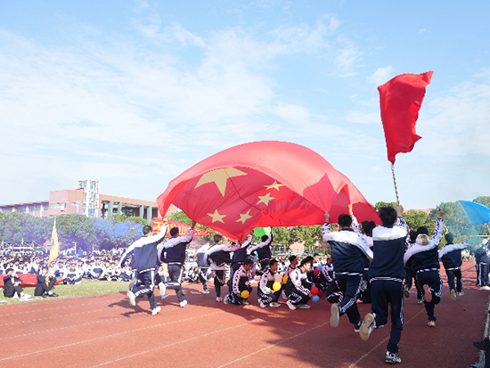 莊嚴的升國旗、奏唱國歌儀式后,黨委副書記、校長陸益飛為本屆運動會致辭。他首先向默默付出的籌備工作人員致以感謝,向精心編排入場式的師生們表示敬意,隨后圍繞“聚力競技華章,智創青春賽道”的主題,鼓勵運動員們以堅韌意志挑戰自我,以協作精神凝聚力量,在賽場上展現體育風采與職業素養,力爭賽出水平、賽出友誼,讓青春在拼搏中綻放光彩。