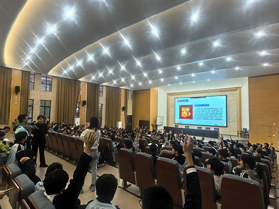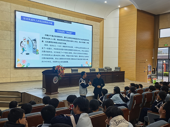 “青少年是國家的未來,必須學(xué)法、知法、懂法!”孟柳霞的開場(chǎng)直切主題。她先從憲法講起:“大家要先弄清憲法賦予的權(quán)利,比如勞動(dòng)權(quán)、受教育權(quán)、休息權(quán);也要牢記應(yīng)盡的義務(wù),像愛國、守法、服兵役,這些都是法治社會(huì)的基礎(chǔ)。”為了讓知識(shí)更易吸收,她現(xiàn)場(chǎng)拋出“我國的根本大法是( )”“專門保護(hù)未成年人的法律是( )”等問題,學(xué)生們紛紛舉手搶答,氣氛瞬間熱烈起來。隨后,孟柳霞重點(diǎn)強(qiáng)調(diào)了兩個(gè)“關(guān)鍵提醒”:一是明確十四至十六周歲青少年需承擔(dān)刑事責(zé)任的“故意殺人、強(qiáng)奸”等八個(gè)特定罪名,二是列出“營(yíng)業(yè)性KTV、歌廳、酒吧”等未成年人不宜進(jìn)入的場(chǎng)所,讓學(xué)生們清晰知曉“法律紅線”。在“防范電信詐騙”“遠(yuǎn)離毒品危害”“拒絕校園欺凌”環(huán)節(jié),她結(jié)合身邊真實(shí)案例,細(xì)致拆解風(fēng)險(xiǎn)點(diǎn)與防范方法,還通過一個(gè)個(gè)互動(dòng)小問題引導(dǎo)學(xué)生主動(dòng)思考,讓法治意識(shí)真正“入耳入心”。講座最后,孟柳霞以“珍惜自身成長(zhǎng),自覺遵守法律,才能避免走上違法犯罪的道路”收尾,為這場(chǎng)課畫上圓滿句號(hào)。“這樣的講座太有用了!不僅學(xué)到了法律知識(shí),還明白該怎么保護(hù)自己,回答問題拿到的馬克杯也很有紀(jì)念意義!”802班的小駱拿著禮物,臉上滿是笑容。