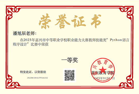 近日,2025年嘉興市中等職業學校職業能力大賽教師技能類“Python語言程序設計”項目比賽在嘉興技師學院圓滿落幕。經過緊張激烈的角逐,嘉善信息技術工程學校潘旭辰教師憑借深厚的編程功底、扎實的教學基本功與創新的課堂設計,從全市眾多參賽教師中脫穎而出,榮獲一等獎(第二名),成功晉級省賽!