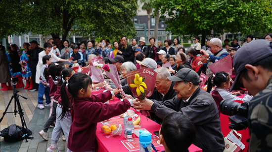 活動在熱鬧的文藝表演中拉開序幕。彩虹社區老年學堂各個團隊輪番登場,悠揚的合唱、輕快的舞蹈、婉轉的葫蘆絲演奏,搭配走秀、朗誦、柔力球、民樂、京劇、非洲鼓等精彩節目,盡顯銀齡群體昂揚向上的精神風貌。更有共建單位錢塘實驗幼兒園的大班小朋友,帶來萌趣十足的歌舞表演,還為在場老人送上手工花與重陽糕,稚嫩的 “爺爺奶奶,節日快樂” 縈繞耳畔,老人們臉上的笑容格外燦爛,現場暖意瞬間升騰。