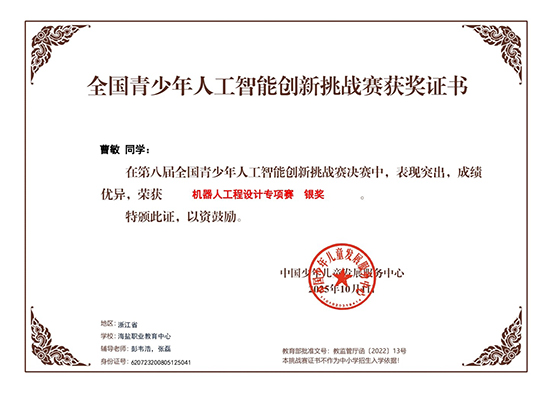 近日,第八屆全國青少年人工智能創新挑戰賽全國總決賽圓滿落幕。海鹽職業教育中心曹敏、王璟文、王小舟學生團隊再度載譽而歸,榮獲一銀、二銅的優異成績!
