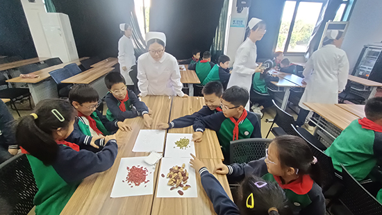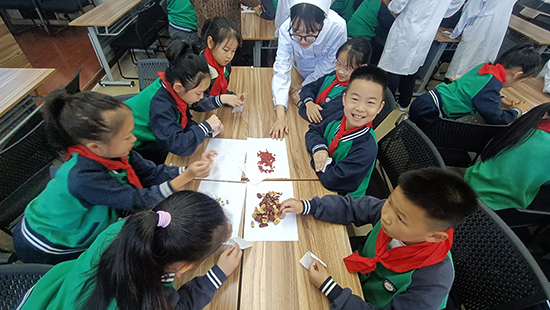 養生茶體驗環節更是氣氛熱烈。2506班的同學們準備了菊花、枸杞、紅棗等藥材,手把手教小學生們配制“養肝明目茶”。在一片歡聲笑語中,一杯杯暖心的養生茶氤氳著藥香,更傳遞著濃濃的敬老情誼。