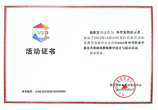 “追風趕月莫停留,平蕪盡處是春山。” 陸依雯教師的優異成績,是學校教師教學能力與育人水平的生動展現。學校將以此為契機,充分發揮優秀教師的示范引領作用,始終堅持“以賽促教、以賽促改、以賽促學、以賽促建”,持續深化教育教學改革。進一步加強教師隊伍建設,全面打磨教師綜合素質,努力打造過硬的優秀教學團隊,為職業教育高質量發展注入強勁動力。(王晴云)