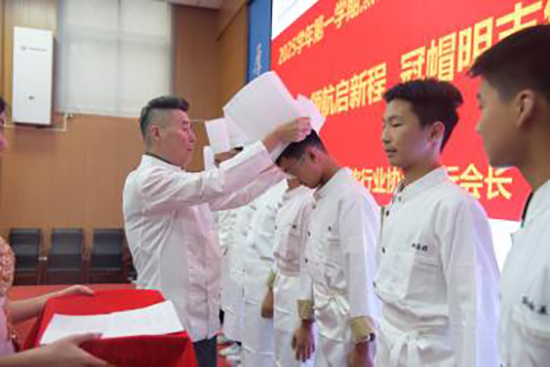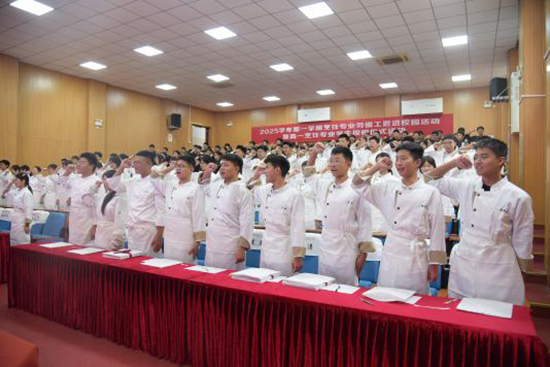 “我宣誓:擇一事、終一生,立志成為一名品德優(yōu)良、技能精湛、身心健康的工匠儒廚!”在孫偉民部長的領(lǐng)誓下,全體新生右手握拳高舉,誓詞穿透報(bào)告廳,落在每個(gè)人的工位牌與職業(yè)裝衣襟上。從此,這頂白帽不再是簡單的服飾,而是系圍裙、握炒勺時(shí)的“初心徽章”,是踐行“命由心造,德自行為”的責(zé)任象征。