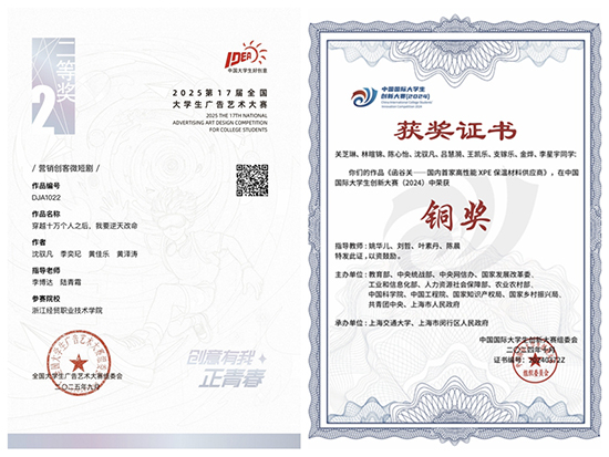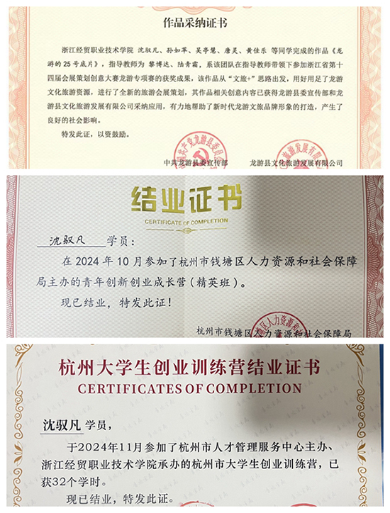 沈馭凡,男,平湖市職業中專工藝美術2023屆畢業生,現就讀于浙江經貿職業技術學院傳播與策劃專業,大學期間擔任團支書、院融媒體中心副負責人及校全媒體中心影像制作部部長等職務。他的實踐足跡輻射校園、鄉村直至國際舞臺,曾以導演助理身份參與國家廣電總局、中央廣播電視總臺紀錄片制作。他累計獲國家級榮譽4項、省市級獎項16項。2025年,他獲得了浙江省普通高職院校國家獎學金。
