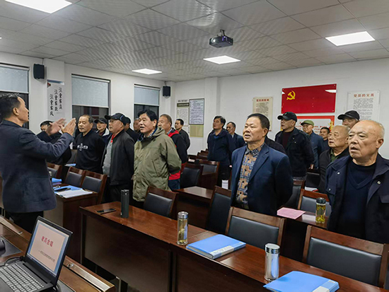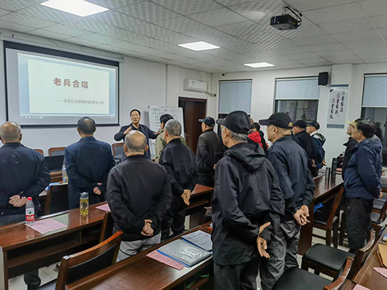 當晚7時,培訓正式拉開帷幕。授課教師張鶴鳴剛走上講臺,便被眼前的場景打動:30名老兵自發列隊,雙腳分開與肩同寬,雙手后背相握,跨立的姿態整齊劃一,仿佛重回軍營時光。“這首歌是咱們老兵的心聲,唱的時候要帶著對黨的忠誠、對軍隊的熱愛!”張老師先詳細講解《人民軍隊忠于黨》的創作背景,從戰火紛飛的歲月講到和平年代的堅守,讓老兵們再次感受歌曲里的紅色情懷。