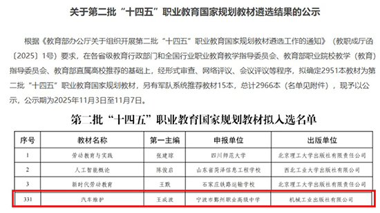 三年內,三本教材接連入選國家級規劃教材,彰顯了學校汽修專業在教材建設方面的系統布局與高質量發展成果,助力“鄞職品牌”在全國職教領域的影響力持續提升。