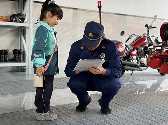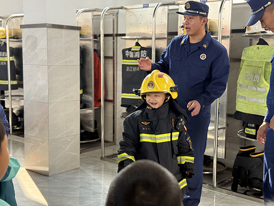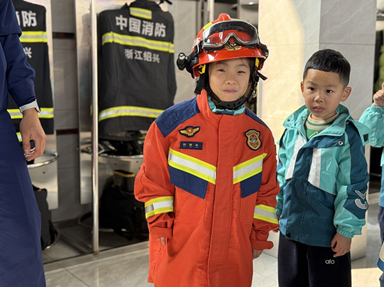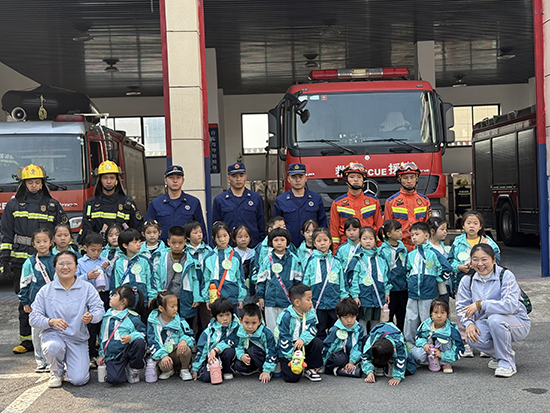 11月14日上午,楓橋鎮第二幼兒園大班幼兒在老師的帶領下走進楓橋鎮消防大隊,開啟了一場“零距離”的消防科技探索之旅。活動伊始,幼兒園舉行了簡潔而莊重的消防法制副校長聘用儀式,分管副園長向消防大隊受聘領導頒發證書,為家園社協同育人搭建堅實橋梁。消防員以兒童化的生動語言,向孩子們普及火災預防知識與報警要點,隨后打開消防車艙門,詳細介紹儲水、救援、照明等核心功能及各類關鍵器材。在消防員的全程引導與看護下,幼兒分組近距離觀察、觸摸消防設備,踴躍試穿消防服、佩戴消防頭盔,親身感受消防裝備的重量與防護力。孩子們還參觀了消防員寢室,目睹一塵不染的環境與“豆腐塊”般的被子,在消防員現場演示疊被子的過程中,直觀體會紀律、秩序與整潔對快速出警的重要意義,并用稚嫩的提問開啟“消防采訪”,滿足探究好奇心。