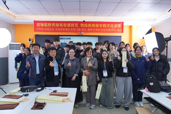 11月26日,湖州交通技學校電商直播實訓中心內暖意融融、笑語盈盈,一場集專業技能實踐與非遺文化體驗于一體的中韓跨國交流活動在此精彩上演。兩國師生以技會友、以文交心,在雙向互動中搭建起友誼之橋,讓湖筆非遺文化在跨國交流中綻放別樣光彩。