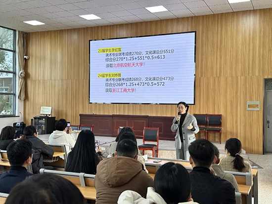 在美術(shù)高考班的集中會議上,基礎(chǔ)專業(yè)部部長裘艷精準闡述了班級的定位,系統(tǒng)梳理了學(xué)生在文化課與專業(yè)課雙向發(fā)展中的獨特優(yōu)勢,并進一步明確科學(xué)清晰的學(xué)業(yè)發(fā)展路徑。