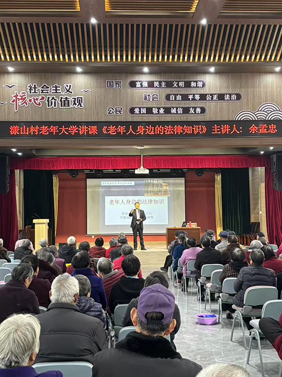 為增強(qiáng)老年人法律維權(quán)意識(shí),筑牢晚年生活法治屏障,11月27日上午,慈溪市宗漢社區(qū)教育中心特邀慈溪市調(diào)解協(xié)會(huì)會(huì)長、寧波調(diào)解學(xué)院特聘講師余孟忠在漾山村老年大學(xué),開展“老年人身邊的法律知識(shí)”專題講座。206名老年學(xué)員帶著老花鏡早早到場(chǎng)等候,不少人提前調(diào)試好手機(jī)相機(jī),準(zhǔn)備記錄維權(quán)要點(diǎn)。