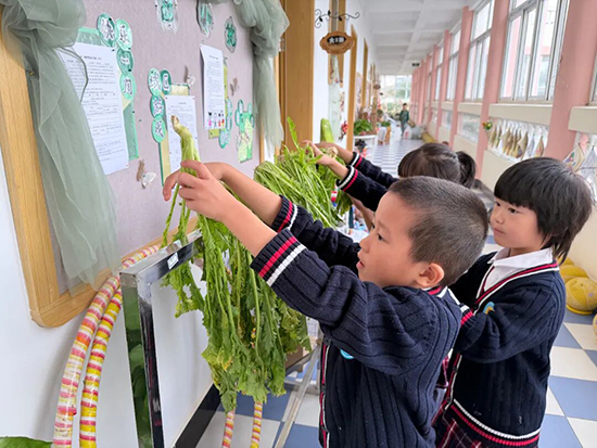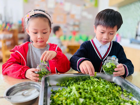 洗菜、曬干、切菜、撒鹽、攪拌、壓實……大班的幼兒化身“小小美食家”,認真處理著新鮮采摘的芥菜。他們仔細地將芥菜一片一片在自來水下沖洗干凈,再整齊晾曬在走廊上;待菜葉陰干后,小心翼翼地用刀切成小顆粒或絲狀,把鹽粒均勻撒入清脆的芥菜絲中,充分攪拌后裝入密封罐子,靜靜等待時光醞釀出獨特的咸香風味。這場動手實踐,是對傳統飲食文化的生動傳承,讓孩子們在勞作中親身體會傳統文化的厚重與煙火氣息。