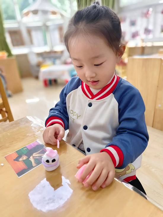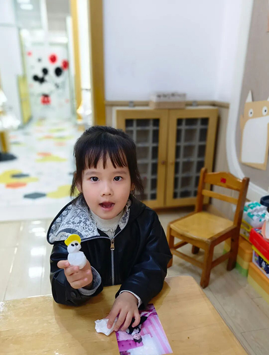 揉一揉、搓一搓、壓一壓……小班的幼兒們用五彩粘土,打造出一個個專屬小雪人。他們專心揉搓粘土,搓成條、揉成團,不一會兒,圓圓的腦袋、胖乎乎的身體便初具雛形;再粘上小小的種子當眼睛,插上彩色面條作鼻子,一個個憨態可掬、模樣各異的小雪人應運而生。孩子們用靈巧的小手賦予粘土鮮活生命力,在創意創作中感受冬日的童趣,也在動手過程中悄悄培養了想象力與專注力。