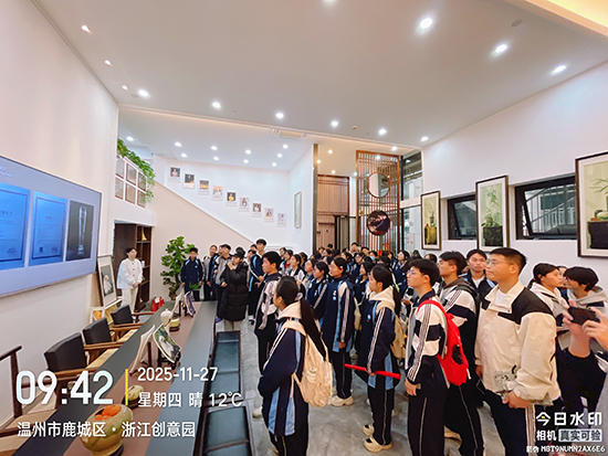 活動(dòng)伊始,師生團(tuán)隊(duì)便抵達(dá)浙江創(chuàng)意園,受到了凱勝數(shù)字貿(mào)易園胡總、浙江工貿(mào)職業(yè)技術(shù)學(xué)院教師團(tuán)隊(duì)及創(chuàng)意園企業(yè)代表的熱情接待。在這一站,師生團(tuán)隊(duì)共同觸摸非遺溫度,感受著文化創(chuàng)新。