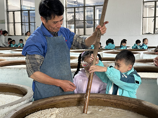 作為斬獲“浙江老字號”“浙江省食品生產(chǎn)企業(yè)衛(wèi)生等級A級單位”“紹興市食品(釀酒)行業(yè)先進企業(yè)”“紹興市誠信企業(yè)”“諸暨市信用管理示范企業(yè)”“諸暨市納稅大戶”等多項榮譽的本土標桿企業(yè),楓橋酒廠為孩子們打開了一扇了解家鄉(xiāng)產(chǎn)業(yè)的窗口。在老師的帶領(lǐng)下,孩子們徒步抵達酒廠,開啟了充滿好奇的探索之旅。走進原料車間,整齊碼放的糯米袋吸引了大家的目光,講解員細致介紹道:“這些可不是日常食用的大米,而是端午節(jié)包粽子用的糯米,是釀酒的核心原料”,孩子們恍然大悟,當?shù)弥茝S一年的糯米用量時,紛紛發(fā)出陣陣驚嘆。發(fā)酵車間里,一排排裝滿酒釀的大缸整齊排列,孩子們圍著釀酒老師傅嘰嘰喳喳地提問,還好奇地拿起攪拌棍嘗試攪拌,切身感受到攪拌的費力與不易,深刻體會到釀酒師傅工作的辛勞。堆壇場地中,高高碼放的酒壇子蔚為壯觀,孩子們紛紛在此合影留念,歡聲笑語中定格下珍貴的瞬間。包裝車間內(nèi),自動化灌裝設(shè)備高速運轉(zhuǎn),晶瑩剔透的酒液被精準灌入酒瓶、酒壇與酒壺中,工人們熟練地完成打包裝箱工序,讓孩子們直觀感受現(xiàn)代工業(yè)的高效與規(guī)范。酒品陳列室里,造型各異的酒瓶琳瑯滿目,令孩子們目不暇接、流連忘返?;顒又校⒆觽冞€主動向潘正海董事長發(fā)起采訪,一個個童稚又貼合實際的問題,得到了潘董事長的耐心解答,互動氛圍溫馨而熱烈。
