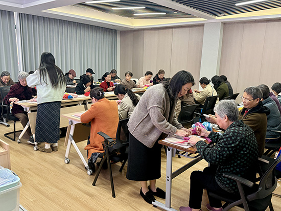 “阿姨們,要先抓出大概的羊毛量,再慢慢將羊毛用戳針戳刺出第一個造型,別一下子拿出太多,之后可以再拿一些羊毛繼續塑形,但大家要注意安全,帶上保護手指套,不要扎到手哦!”工作人員一邊巡視指導,一邊反復叮囑安全事項,耐心解答老人們遇到的問題。