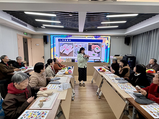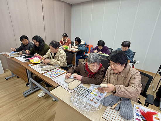 活動現場暖意融融,來自沐元職業培訓的范老師早已備好各色羊毛、圖案模板和戳針等材料。“今天帶阿姨們做一雙超可愛的毛茸茸的羊毛氈手套,俗稱‘戳戳樂’”隨著范老師熱情的講解,大家迅速投入創作,在場的老人們紛紛挑選自己喜愛的羊毛顏色,小心翼翼地將羊毛扯散、鋪平,再對照桌上的星星、花朵、小動物等圖案模板,手持戳針細細戳制,“阿姨們都是第一次嘗試,如果怕失敗,可以選擇藍天云朵這樣簡單的圖案。”