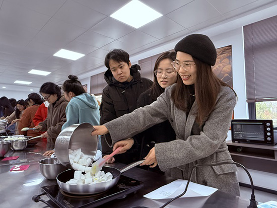 實操環節中,培訓室瞬間熱鬧起來。班主任們分組協作,稱量食材、融化黃油、攪拌棉花糖,有條不紊地開展操作。遇到攪拌力度不足導致棉花糖結塊的問題時,常老師立刻上前手把手指導,調整攪拌手法和速度。當一顆顆裹著堅果碎的牛軋糖在模具中成型時,大家紛紛拿出包裝紙進行封裝,臉上洋溢著成就感。