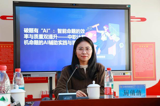 活動最后,三位教師帶來命題專題分享。錢如如老師以《從“解題”到“解情境”:中職計算機命題的情境化設計》為題,詳細介紹了自己的命題思路與實踐過程,分享了如何將知識點融入真實生活情境的命題亮點;周倩倩老師在《破題有“AI”:智能命題的效率與質量雙提升》中,毫無保留地分享了運用AI工具快速生成試題、優化命題質量的實用技巧,為提升命題效率提供了新路徑;陳旭淋老師則以《以賽為鏡,照進教學——中職計算機命題比賽的經驗與收獲》為題,講述了自己參與命題比賽的經歷,分享了以賽促研、以賽促教的成長感悟,為與會教師提供了寶貴參考。?