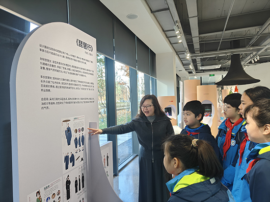 在上城區(qū)文化特派員張西琴的介紹下,孩子們的好奇心被徹底點燃。在《老鼠嫁女》展區(qū),大家圍著手稿追問苗族刺繡的寓意;看到《琵琶行》的服飾配色變化,有同學(xué)主動分享自己對詩句的理解。張西琴為孩子們搭建起通往專業(yè)藝術(shù)領(lǐng)域的橋梁,她結(jié)合展品細致拆解設(shè)計背后的文化內(nèi)涵與創(chuàng)作邏輯,讓孩子們讀懂蒙古族圖騰、唐代服飾形制如何與劇情深度融合,明白AI技術(shù)如何為傳統(tǒng)紋樣數(shù)字再生賦能。