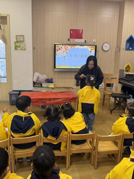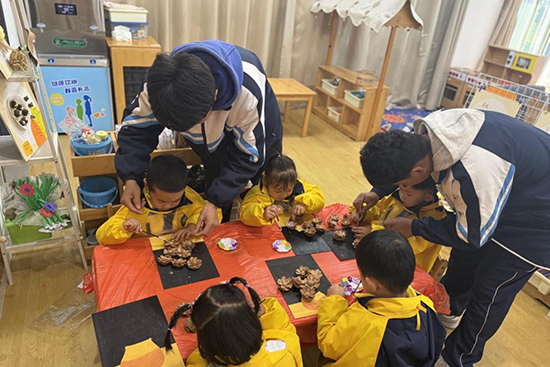 在五愛幼兒園中心園區(qū),建筑專業(yè)的趙佳榕老師與同學們帶來了一堂特別的“松果裝飾課”。孩子們事先在校園、公園里收集來的松果,成為這節(jié)課最重要的“教具”。結(jié)合建筑室內(nèi)裝飾的設(shè)計思維,師生們引導幼兒將松果修剪、涂色,再拼貼在手繪小畫板上。原本落地的松果,經(jīng)過色彩點綴和創(chuàng)意布局,變成一幅幅獨具自然美感的裝飾畫。課程不僅鍛煉了幼兒的動手能力和色彩感知,也讓“廢物利用、創(chuàng)意生活”的美育理念悄然生根。