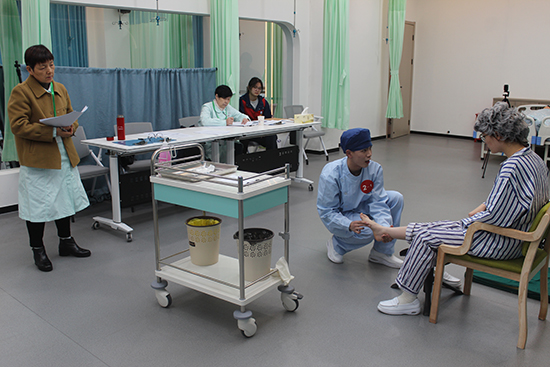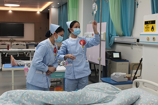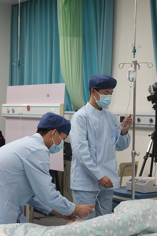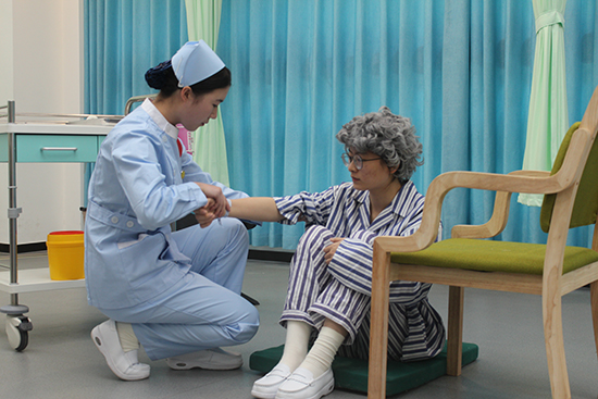 第一賽道要求2名選手協作完成呼吸心跳驟停患者救護,含雙人心肺復蘇與靜脈輸液,15分鐘內完成,占總成績50%;第二賽道由組內抽簽1人完成老年患者跌倒照護,涉及右踝關節扭傷包扎與輪椅運送,同15分鐘完成,占40%。兩賽道均配標準化病人還原真實場景,評委以專業公正態度評分,保障結果可信。
