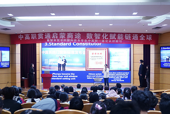師生們走進育英校史館,在講解員的引導下,沿著“崇商”發(fā)展脈絡,回溯育英辦學歷程,重溫習近平總書記視察育英學院的殷切囑托。從校史文獻到育英專題展區(qū),大家重溫“厚德載物,自強不息”的育英精神,聆聽奮斗故事,更深刻理解了職業(yè)教育“以技立身、以商報國”的使命與擔當,職業(yè)教育的初心在這一刻悄然扎根。在數(shù)智商貿學院直播電商實訓基地,師生們沉浸式體驗了虛擬演播廳、智能直播設備及數(shù)據(jù)監(jiān)控系統(tǒng),直觀感受“數(shù)字+商貿”新業(yè)態(tài)的運作模式。國際商務專業(yè)負責人傅祝屏系統(tǒng)介紹了中高職一體化人才培養(yǎng)體系,強調數(shù)智化、國際化、一體化辦學特色。國商專業(yè)社團“外貿人協(xié)會”現(xiàn)場展示了2025年全國高校商業(yè)精英挑戰(zhàn)賽國際貿易賽項一等獎作品——“皇派智能門窗系統(tǒng)外貿產品發(fā)布會”,展示從市場調研、產品策劃、外貿推廣到客戶溝通的全流程,展現(xiàn)國際商務人才的核心能力。杭州九捷國際貨運代理有限公司市場總監(jiān)嚴慧琴經理帶來的“智慧物流、數(shù)字報關”案例分享,幫助學生理解“中國智造”如何通過高效物流走向世界。讓同學們真切感受到:國際商務不再是“紙上談兵”,而是用數(shù)智技術鏈接全球市場的實戰(zhàn)能力。