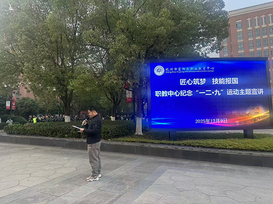 在各團支部的主題團課上,班主任和團干部們化身“紅色講解員”,通過老照片、歷史紀錄片、情景講述等多種形式,生動再現了一二·九運動的壯闊歷程。為擴大活動覆蓋面,營造全員參與的濃厚氛圍,校團委聯合德育處開展“匠心筑夢 技能報國”主題宣講。校團委書記倪夢霞、校德育主任徐先鋒將一二·九運動的歷史意義與當代職校生的成長成才緊密結合,帶來了兩場有溫度、有深度的宣講。宣講結束后,全體師生莊嚴列隊,在領誓人學生會主席的帶領下,大家高舉右拳,字字鏗鏘:“銘記一二•九歷史,傳承愛國精神;錘煉專業技能,勇擔時代使命;勤學善思篤行,不負青春韶華;匠心筑夢強國,書寫復興華章!”激昂的誓言回蕩在校園上空,既是對革命先輩的致敬,更是職教青年矢志報國的堅定承諾。“一二·九運動的硝煙早已散盡,但‘愛國、進步、民主、科學’的精神永遠不會過時。”副校長劉著程在活動總結時強調:“作為職教青年,大家既要銘記歷史,更要立足當下——在實訓室里精益求精,在課堂上勤學善思,在志愿服務中傳遞溫暖,這就是對一二·九精神最好的傳承。”