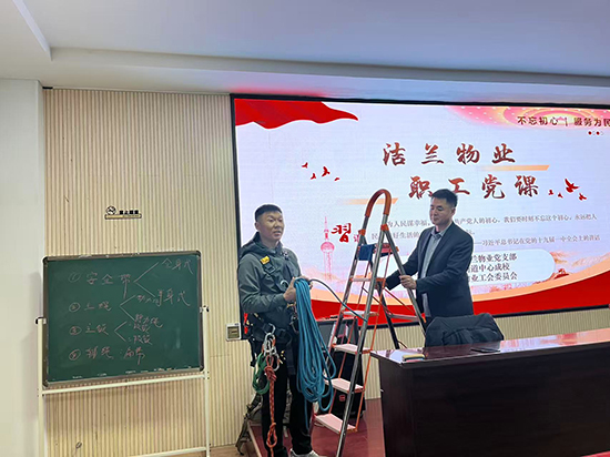 培訓(xùn)現(xiàn)場,昌碩成校的講師團(tuán)隊圍繞“物業(yè)履約考核標(biāo)準(zhǔn)”展開深度解讀——從履約細(xì)則到考核指標(biāo),結(jié)合《小區(qū)空房巡查情況匯總表》等實(shí)際工作表單,拆解日常服務(wù)中的規(guī)范要點(diǎn),幫助員工明確崗位履職的核心要求。而在應(yīng)急安全培訓(xùn)環(huán)節(jié),講師通過“現(xiàn)場演示+工具實(shí)操”的方式,講解高空作業(yè)安全帶、繩索等防護(hù)裝備的規(guī)范使用方法,黑板上清晰羅列的“安全、主繩、輔繩”等操作要點(diǎn),讓員工直觀掌握了高空作業(yè)的安全防護(hù)技能。