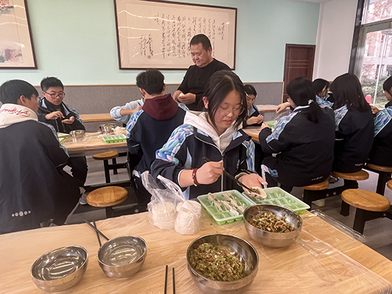 活動當天,食堂一改往日“單向供餐”的模樣,搖身變成溫馨的“家庭廚房”。有的家長手法嫻熟,搟出的餃子皮薄如紙、圓如月。有的學生第一次包餃子,雖然包得歪歪扭扭,卻滿臉自豪。老師們也不甘示弱,一邊包一邊打趣:“這褶子捏得,比我寫教案還認真!”
