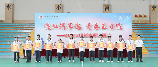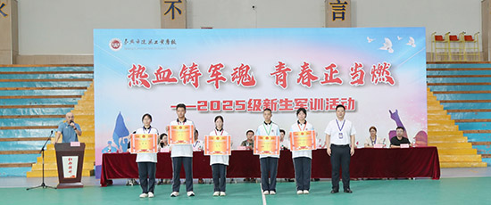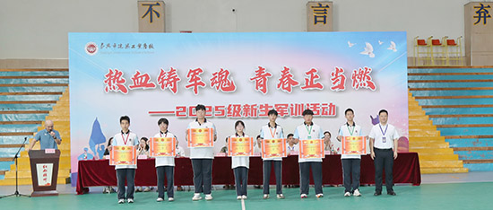校領導依次為軍訓會操比武優勝班級、軍訓活動先進班級頒發獎狀。