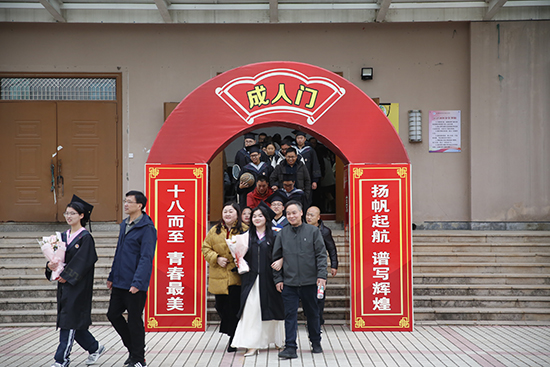 第四篇章“十八啟航·奔赴未來(lái)”為2023級(jí)學(xué)生舉行了莊重的成人禮儀式。在23電子班魏世勇、覃喆演唱的《像風(fēng)一樣》歌聲中,儀式正式拉開(kāi)序幕。學(xué)生代表深情朗誦《十八歲暢想》,抒發(fā)了對(duì)成長(zhǎng)的理解與對(duì)未來(lái)的憧憬;隨后,家長(zhǎng)代表為孩子們佩戴象征責(zé)任與擔(dān)當(dāng)?shù)某扇嘶照拢瑐鬟f著長(zhǎng)輩的關(guān)愛(ài)與期許;教師代表深情寄語(yǔ),勉勵(lì)同學(xué)們勇?lián)鷷r(shí)代使命。全體學(xué)生面向師長(zhǎng)鄭重鞠躬致謝,并舉起右拳莊嚴(yán)宣誓,承諾履行公民責(zé)任,立志成為有用之才。最后,在十佳歌手領(lǐng)唱的《我的未來(lái)不是夢(mèng)》歌聲中,全體高三學(xué)子攜手老師和家長(zhǎng),滿懷信心地走過(guò)象征著成長(zhǎng)與希望的“成人門”,完成了從青少年到成人的重要跨越。