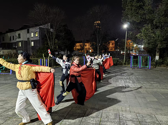 寒假雖至,安吉縣社區教育學院靈峰分院的校園外卻熱鬧依舊。1月上旬的夜晚,靈峰街道公園的健身廣場上,戲曲基本功進修班的老年學員們正跟著唐老師排練川劇變臉伴舞——她們身披紅綢、手持龍紋彩旗,臉上的戲曲臉譜與靈動的動作相映成趣,在路燈下勾勒出一道獨特的 “銀發風景線”。