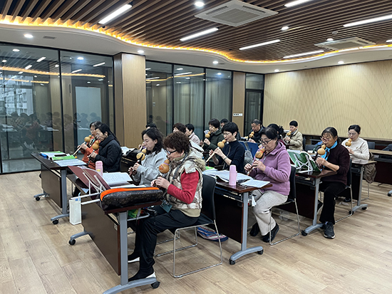 葫蘆絲班的課堂上,曾是零基礎(chǔ)的學(xué)員們手持樂器,指尖翻飛間,《月光下的鳳尾竹》《映山紅》等經(jīng)典曲目緩緩流淌。從氣息控制到指法練習(xí),從單音吹奏到樂曲合奏,在老師耐心細致地指導(dǎo)下,老人們攻克了一個又一個難關(guān),將悠揚婉轉(zhuǎn)的旋律化作對生活的熱愛。結(jié)業(yè)展示時,學(xué)員們默契配合,合奏曲目贏得滿堂喝彩。